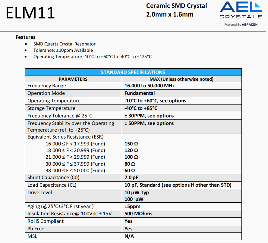 | ELLS-4.000MHz-16-R120-B1X-F-T | AEL Crystals | ELLS | 4 MHz | ±20ppm | ±10ppm | 16 pF |