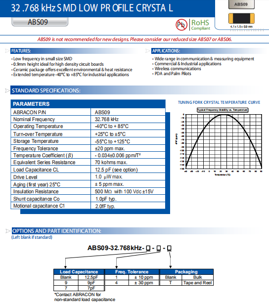 ABRACON晶振,ABS09-32.768KHZ-1-T晶振,ABS09晶振,貼片晶體.貼片表晶32.768K系列具有超小型,薄型,質(zhì)地輕的表面貼片音叉型石英晶體諧振器,晶振產(chǎn)品本身具備優(yōu)良的耐熱性,耐環(huán)境特性,在辦公自動化,家電領(lǐng)域,移動通信領(lǐng)域可發(fā)揮優(yōu)良的電氣特性,符合無鉛標(biāo)準(zhǔn),滿足無鉛焊接的回流溫度曲線要求,金屬外殼的石英晶振使得產(chǎn)品在封裝時能發(fā)揮比陶瓷晶振外殼更好的耐沖擊性能.