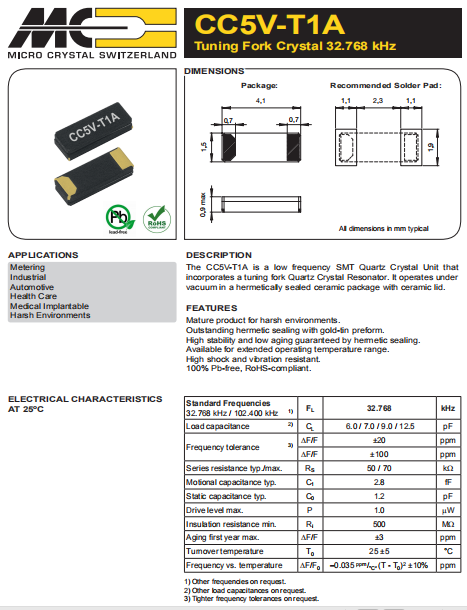 Microcrystal晶振,CC5V-T1A-32.768kHz-12.5pF-20PPM-TA-QC晶振,CC5V-T1A晶振,貼片無源晶振