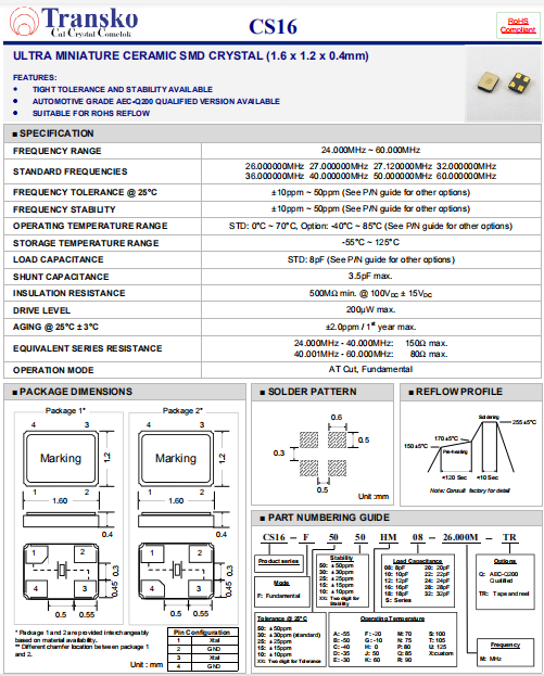 Transko晶振,CS16晶振,無(wú)鉛環(huán)保晶體.貼片壓電石英晶體,體積小,焊接可采用自動(dòng)貼片系統(tǒng),產(chǎn)品本身小型,表面貼片晶振,特別適用于有小型化要求的電子數(shù)碼產(chǎn)品市場(chǎng)領(lǐng)域,因產(chǎn)品小型,薄型優(yōu)勢(shì),耐環(huán)境特性,包括耐高溫,耐沖擊性等,在移動(dòng)通信領(lǐng)域得到了廣泛的應(yīng)用,晶振產(chǎn)品本身可發(fā)揮優(yōu)良的電氣特性,滿(mǎn)足無(wú)鉛焊接的高溫回流溫度曲線(xiàn)要求.