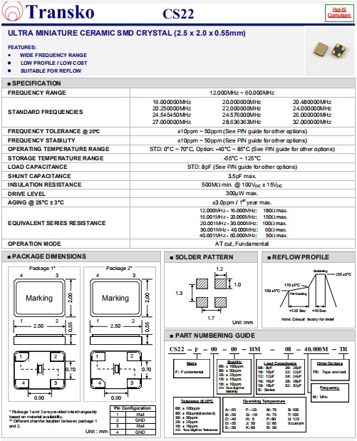 Transko晶振,CS22晶振,進(jìn)口貼片晶振.小型貼片石英晶振,外觀尺寸具有薄型表面貼片型石英晶體諧振器,特別適用于有小型化要求的市場領(lǐng)域,比如智能手機(jī),無線藍(lán)牙,平板電腦等電子數(shù)碼產(chǎn)品.晶振本身超小型,薄型,重量輕,晶體具有優(yōu)良的耐環(huán)境特性,如耐熱性,耐沖擊性,在辦公自動(dòng)化,家電相關(guān)電器領(lǐng)域及Bluetooth,Wireless LAN等短距離無線通信領(lǐng)域可發(fā)揮優(yōu)良的電氣特性,滿足無鉛焊接的回流溫度曲線要求.