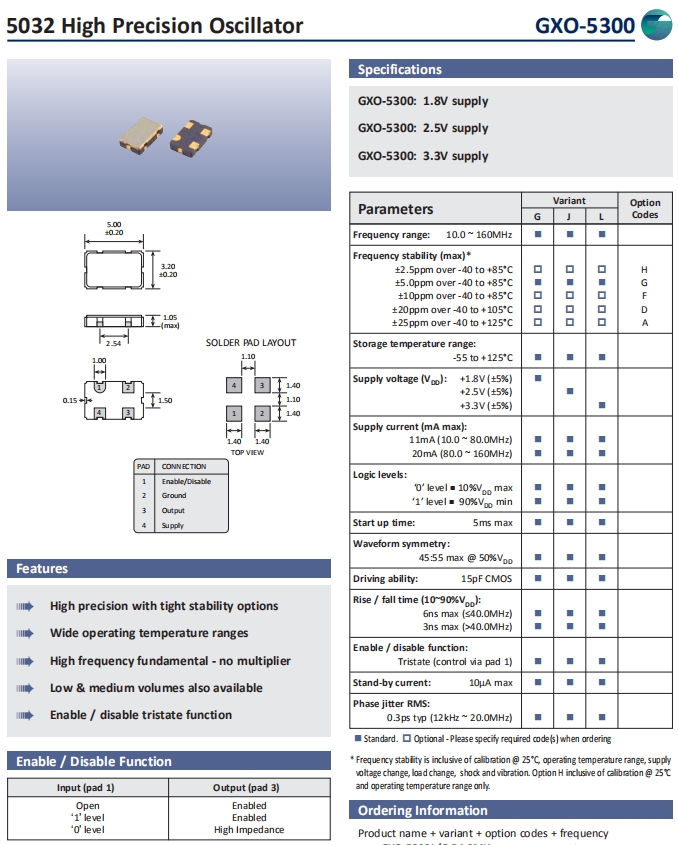 Golledge晶振,GXO-5300晶振,石英晶體振蕩子.5032mm體積的石英晶體振蕩器,有源晶振,該產品可驅動2.5V的溫補晶振,壓控晶振,VC-TCXO晶體振蕩器產品,電源電壓的低電耗型,編帶包裝方式,可對應自動高速貼片機自動焊盤,及IR回流焊盤(無鉛對應),為無鉛產品,小型,質地輕.產品被廣泛應用到集成電路,程控交換系統,無線發射基站.