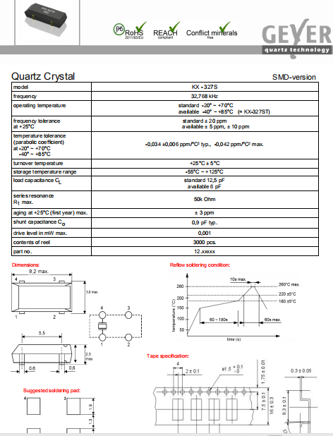 Geyer晶振,KX-327S晶振,無鉛環保晶振.超小型,薄型,質地輕的表面貼片音叉型石英晶體諧振器,手機晶體,產品體積小,特別適用于各種小巧的便攜式消費電子數碼產品,在移動通信領域得到了廣泛的應用,晶振產品本身可發揮優良的電氣特性,滿足無鉛焊接的高溫回流溫度曲線要求.