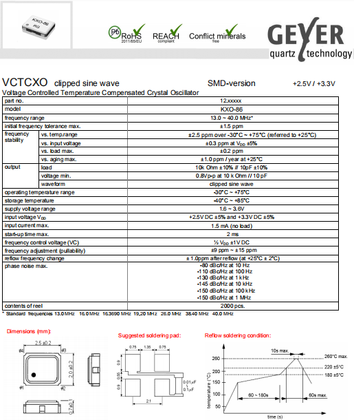 Geyer晶振,KXO-86晶振,VC-TCXO晶振.2520mm體積的石英晶體振蕩器,有源晶振,該產(chǎn)品可驅(qū)動2.5V的溫補晶振,壓控晶振,VC-TCXO晶體振蕩器產(chǎn)品,電源電壓的低電耗型,編帶包裝方式,可對應自動高速貼片機自動焊接,及IR回流焊接(無鉛對應),為無鉛產(chǎn)品,超小型,質(zhì)地輕.產(chǎn)品被廣泛應用到集成電路,程控交換系統(tǒng),無線發(fā)射基站.