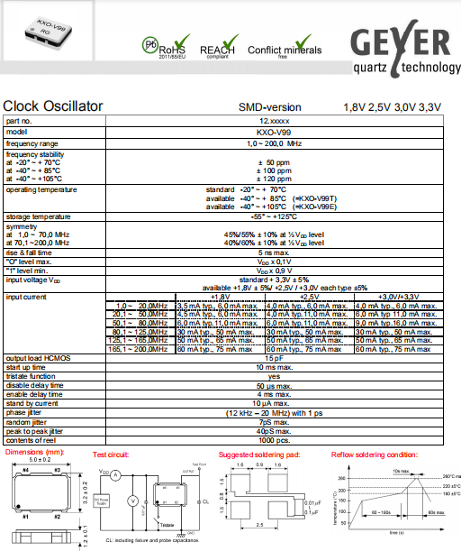 Geyer晶振,KXO-V99晶振,有源晶體振蕩器.小型SMD有源晶振,從最初超大體積到現(xiàn)在的7050mm,6035mm,5032mm,3225mm,2520mm體積,有著翻天覆地的改變,體積的變小也使產(chǎn)品帶來了更高的穩(wěn)定性能,接縫密封石英晶體振蕩器,精度高,覆蓋頻率范圍寬的特點,SMD高速自動安裝和高溫回流焊設(shè)計,Optionable待機(jī)輸出三態(tài)輸出功能,電源電壓范圍:1.8V~5 V,高穩(wěn)定性,低抖動,低功耗,主要應(yīng)用領(lǐng)域:無線通訊,高端智能手機(jī),平板筆記本W(wǎng)LAN,藍(lán)牙,數(shù)碼相機(jī),DSL和其他IT產(chǎn)品的晶振應(yīng)用,三態(tài)功能,PC和LCDM等高端數(shù)碼領(lǐng)域,符合RoHS/無鉛.