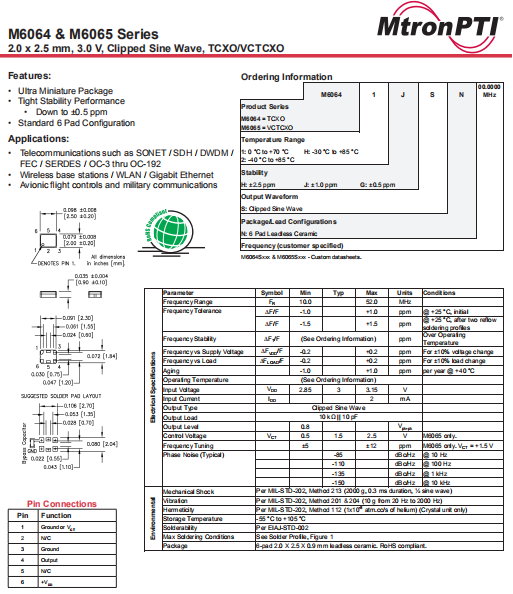 MTRONPTI晶振,M6065晶振,VC-TCXO晶振.2520mm體積的晶振,可以說是目前小型數(shù)碼產(chǎn)品的福音,目前超小型的智能手機里面所應(yīng)用的就是小型的石英晶振,該產(chǎn)品最適用于無線通訊系統(tǒng),無線局域網(wǎng),已實現(xiàn)低相位噪聲,低電壓,低消費電流和高穩(wěn)定度,超小型,質(zhì)量輕等產(chǎn)品特點,產(chǎn)品本身編帶包裝方式,可對應(yīng)自動高速貼片機應(yīng)用,以及高溫回流焊接(產(chǎn)品無鉛對應(yīng)),為無鉛產(chǎn)品.