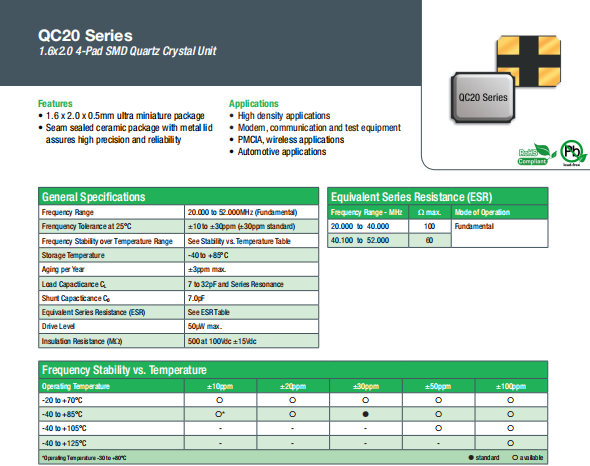 Qantek晶振,QC20晶振,貼片無源晶振.貼片晶振本身體積小,超薄型石英晶體諧振器,特別適用于有目前高速發(fā)展的高端電子數碼產品,因為晶振本身小型化需求的市場領域,小型,薄型是對應陶瓷諧振器(偏差大)和普通的石英晶體諧振器(偏差小)的中間領域的一種性價比較出色的產品.產品廣泛用于筆記本電腦,無線電話,衛(wèi)星導航HDD,SSD,USB,Blu-ray等用途,符合無鉛焊接的高溫回流焊曲線特性.