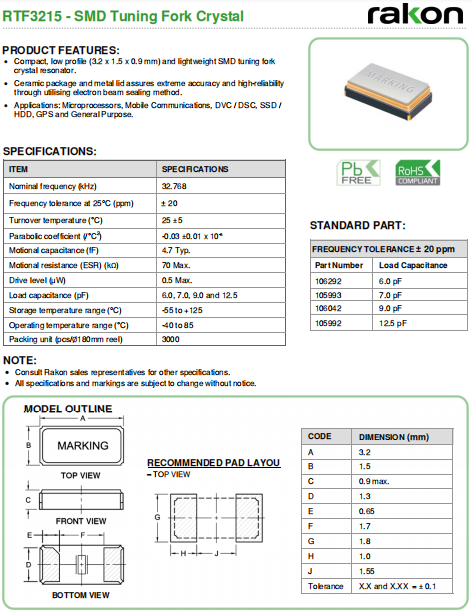 Rakon晶振,RTF3215晶振,壓電石英晶體.32.768K時鐘晶體具有小型,薄型,輕型的貼片晶振表面音叉型晶體諧振器,產品具有優(yōu)良的耐熱性,耐環(huán)境特性,可發(fā)揮晶振優(yōu)良的電氣特性,符合RoHS規(guī)定,滿足無鉛焊接的高溫回流溫度曲線要求,金屬外殼的封裝使得產品在封裝時能發(fā)揮比陶瓷諧振器外殼更好的耐沖擊性.