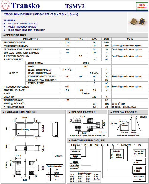 Transko晶振,TSMV2晶振,壓控晶體振蕩器.智能手機(jī)晶振,產(chǎn)品具有高精度超小型的表面貼片型石英晶體振蕩器,最適用于移動(dòng)通信終端的基準(zhǔn)時(shí)鐘等移動(dòng)通信領(lǐng)域.比如智能手機(jī),無線通信,衛(wèi)星導(dǎo)航,平臺(tái)基站等較高端的數(shù)碼產(chǎn)品,晶振本身小型,薄型具備各類移動(dòng)通信的基準(zhǔn)時(shí)鐘源用頻率,貼片晶振具有優(yōu)良的電氣特性,耐環(huán)境性能適用于移動(dòng)通信領(lǐng)域,滿足無鉛焊接的高溫回流溫度曲線要求.