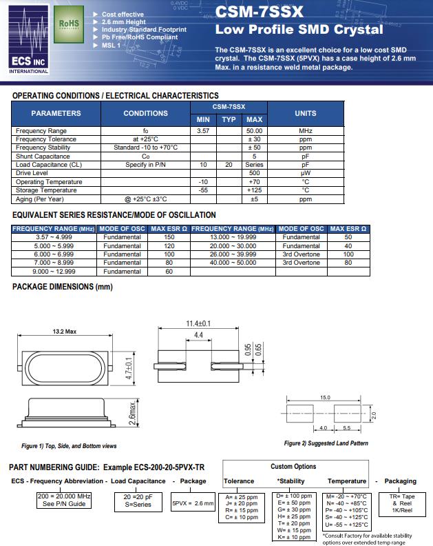 | ECS-200-20-5PVX | CSM-7SSX | 20MHz | ±30ppm | 20pF | -10°C ~ 70°C | HC49/US |