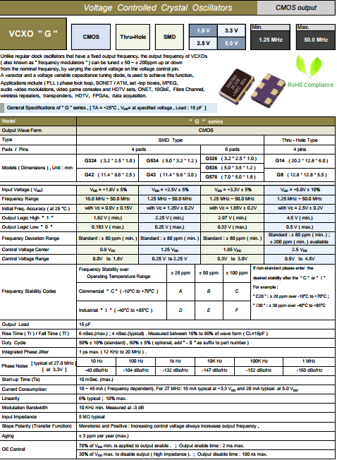 MERCURY晶振,瑪居禮壓控晶振,G576振蕩器.VCXO是指這款晶體產(chǎn)品控制功能只有單壓控也就是電壓控制功能,產(chǎn)品本身頻率精度可以隨著電壓搞定起伏來自動調(diào)整頻率,使產(chǎn)品永遠控制在一定的頻率范圍,壓控晶振(VCXO)壓控石英晶體振蕩器基本解決方案,PECL輸出,輸出頻率60 MHz到200 MHz之間,出色的低相位噪聲和抖動,三態(tài)功能,應用:SDH/ SONET,以太網(wǎng),基站,筆記本晶振應用, VCXO,壓控晶體應用:調(diào)制解調(diào)器,ADSL網(wǎng)絡控制器,無線基站,程控交換設(shè)備智能手機,筆記本晶振等.