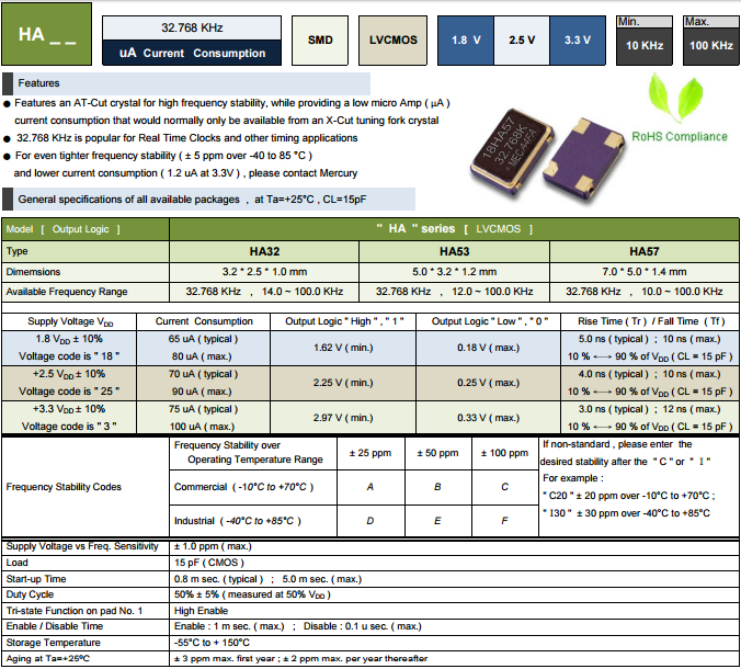 MERCURY晶振,MERCURY時鐘振蕩器,HA32晶振.貼片有源石英晶振是指在普通無源晶體上增加了電壓,內(nèi)部集成了相應(yīng)IC與電容電阻,需要在凈化萬級車間生產(chǎn),并且在密封機器設(shè)備中焊接加蓋,內(nèi)部封裝模式是指在真空封裝區(qū)域內(nèi)進行封裝.1.防止外界氣體進入組件體內(nèi)受到污染和增加應(yīng)力的產(chǎn)生;2.使組件在真空下電阻減小;3.氣密性高.此技術(shù)為研發(fā)及生產(chǎn)超小型,超薄型石英晶體元器必須攻克的關(guān)鍵技術(shù)之一