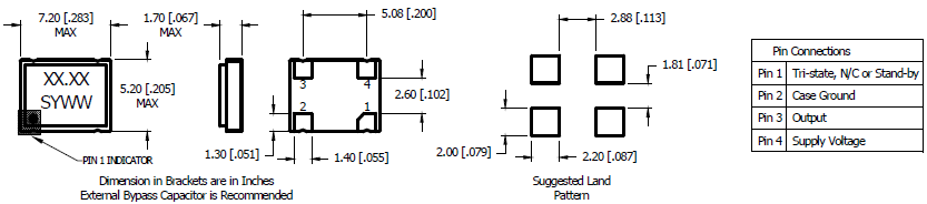 MIH305048AH-25.000MHZ-T,Mmdcomp石英晶振,7050mm振蕩器,無(wú)線模塊晶振,尺寸圖
