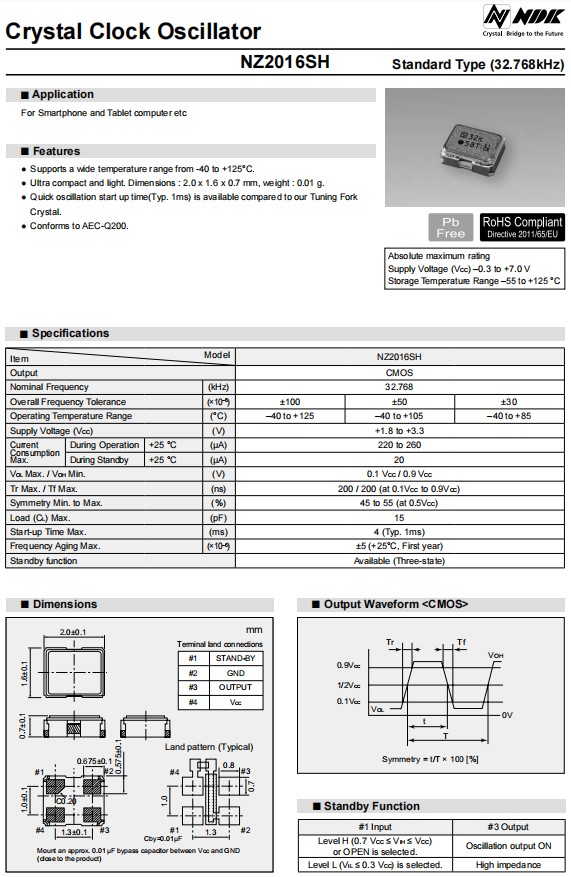 NZ2016SH-24.000MHZNSC5022C平板電腦晶振,NDK晶體振蕩器,日本NDK晶振,進口晶振,NZ2016SH型號是一款小體積晶振尺寸2.0x1.6x0.7mm四腳貼片晶振,32.768KHz晶振,石英晶體振蕩器,有源晶振,無鉛環(huán)保晶振,支持寬溫度范圍從-40°C到+125°C,超緊湊和輕,重量:0.01g,快速振蕩啟動時間(類型,1ms)是可用的相比,符合AEC-Q200,電源電壓(VCC)-0.3至+7.0 V,石英晶體振蕩器具有超小型,輕薄型,耐熱及耐環(huán)境特點,適用于智能手機,平板電腦,鐘表電子,無線網絡,藍牙模塊,可穿戴設備,汽車電子,醫(yī)療設備,物聯(lián)網應用等