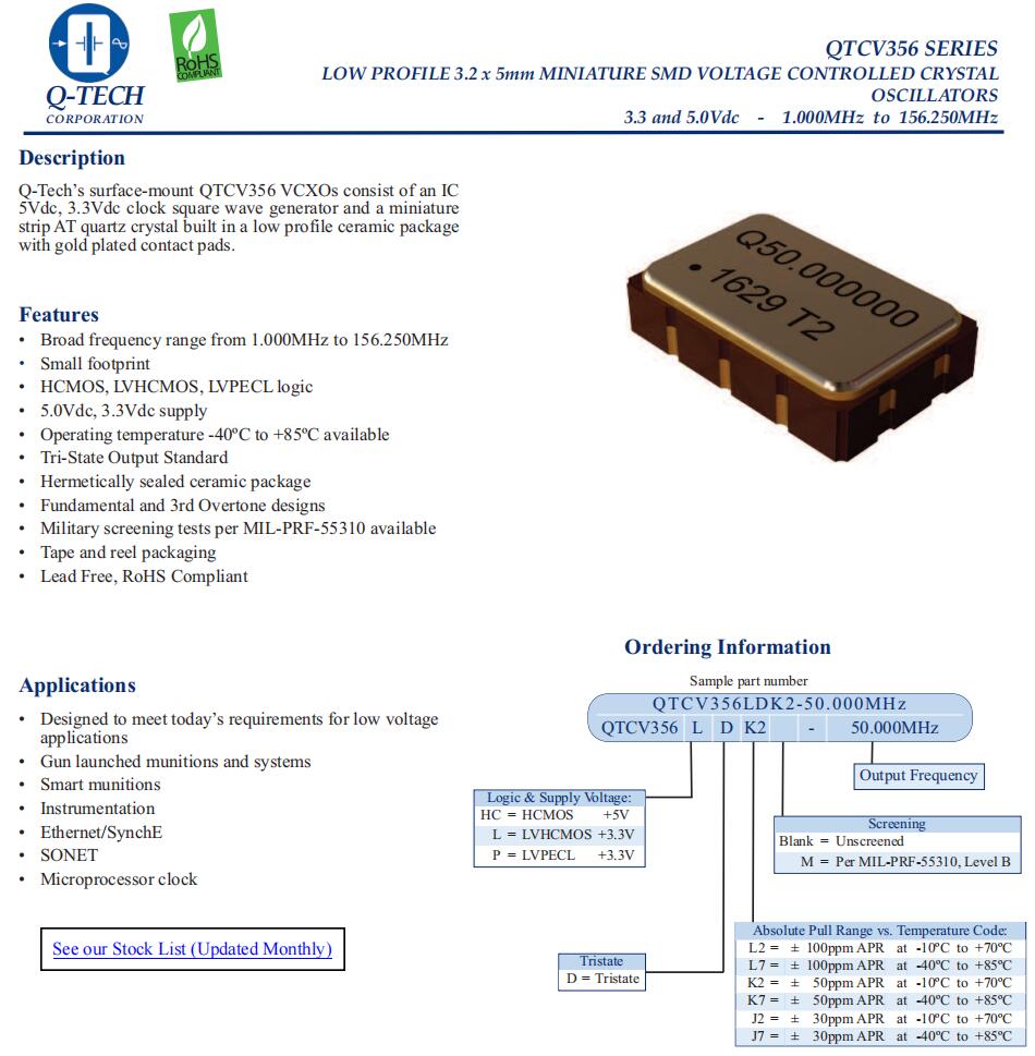 QTCV356PDK7-52.000MHz,6G放大器晶振,LVPECL差分晶振, Q-Tech晶振,QTCV356進(jìn)口有源晶振,QTCV356PDK7-52.000MHz晶振,5032mm貼片晶振,LVPECL差分晶振,石英晶體振蕩器,頻率52MHz,工作溫度-40~85°C,電壓3.3V,頻率穩(wěn)定性50ppm,低抖動晶振,低相噪晶振,6G放大器晶振,以太網(wǎng)應(yīng)用晶振,儀器儀表應(yīng)用晶振,微處理時鐘晶振,SONET晶振,智能彈藥晶振.