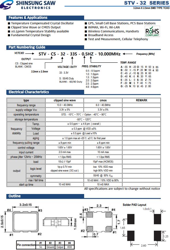 韓國新松晶振,STV-32貼片溫補(bǔ)晶振,STV-CS-32-33S-0.5HZ-10.000MHz有源振蕩子,小型SMD有源晶振,從最初超大體積到現(xiàn)在的7050mm,6035mm,5032mm,3225mm,2520mm體積,有著翻天覆地的改變,體積的變小也使產(chǎn)品帶來了更高的穩(wěn)定性能,接縫密封石英晶體振蕩器,精度高,覆蓋頻率范圍寬的特點,SMD高速自動安裝和高溫回流焊設(shè)計,Optionable待機(jī)輸出三態(tài)輸出功能,電源電壓范圍:1.8V~5V,高穩(wěn)定性,低抖動,低功耗,主要應(yīng)用領(lǐng)域:無線通訊,高端智能手機(jī),平板筆記本W(wǎng)LAN,藍(lán)牙,數(shù)碼相機(jī),DSL和其他IT產(chǎn)品的晶振應(yīng)用,三態(tài)功能,PC和LCDM等高端數(shù)碼領(lǐng)域,符合RoHS/無鉛.