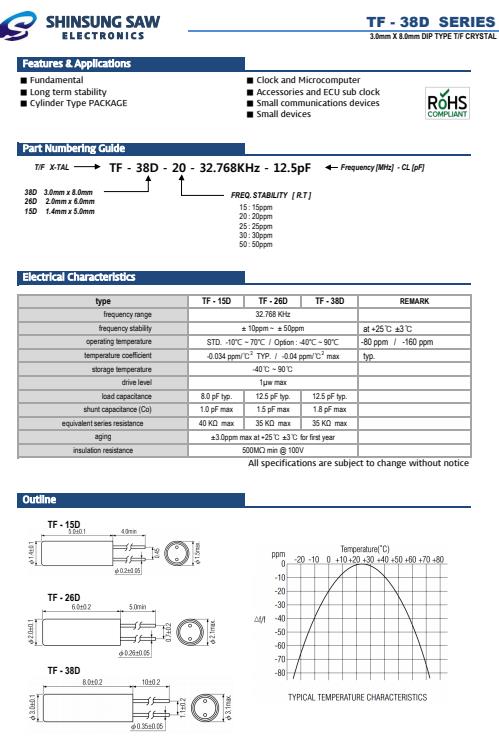 所有石英晶體諧振器和實時時鐘模塊都以IC形式提供.SHINSUNG晶振,TF-26D插件音叉晶體,TF-26D-15-32.768KHz-12.5pF晶振.