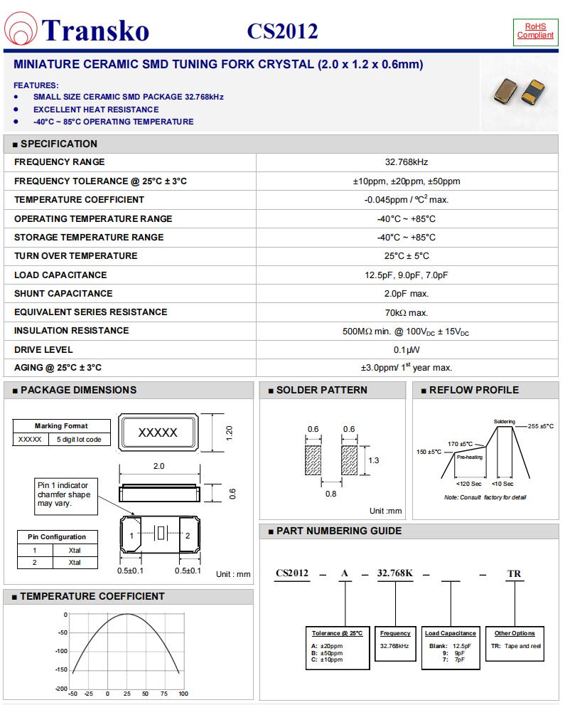 Transko晶振|CS2012-A-32.768K-TR|2012mm|6G光纖通道晶振參數(shù)表