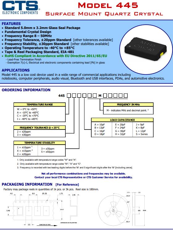 | 445A35K24M57600 | CTS晶振 | 445 | 24.576MHz | 2-SMD, No Lead |