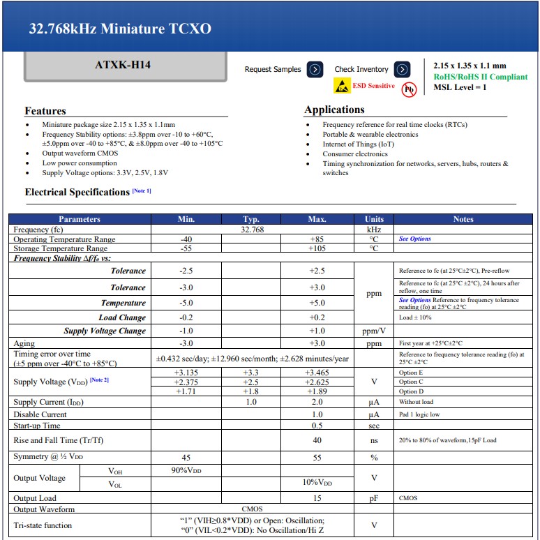 更多>>32.768kHz微型TCXO晶振ATXK-H14-E-32.768kHz-E50-T3用于便攜式電子設備