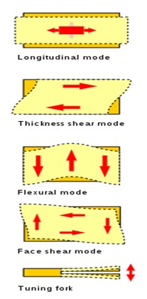 運用石英晶振上的電極對一顆被適當切割並安置的石英晶體施以電場時,晶體會產生變形。這就是壓電效應。當外加電場移除時,石英晶體會恢復原狀並發出電場,因而在電極上產生電壓。這樣的特性造成石英晶體在電路中的行為,類似於某種電感器、電容器、與電阻器所組合成的RLC電路。組合中的電感電容諧振頻率則反映了石英晶體