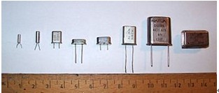 各式石英晶體外觀,最右側一個是石英晶體振盪器模組