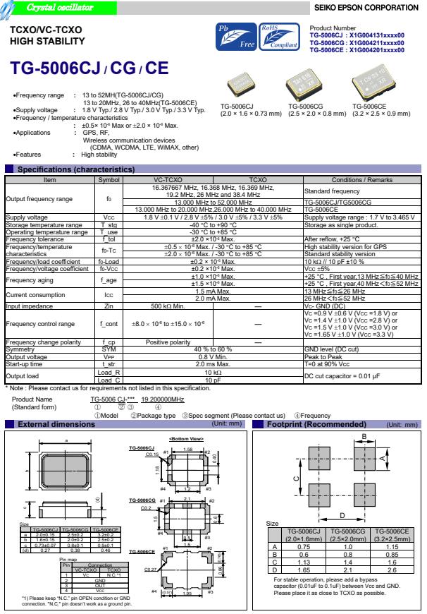 | X1G004211001600 | TG-5006CG | 19.200000 MHz | 2.50 x 2.00 x 0.80 mm | 2.850 to 3.150 V | +/-2.0 ppm | -30 to +85 °C | +/-2.00 ppm |