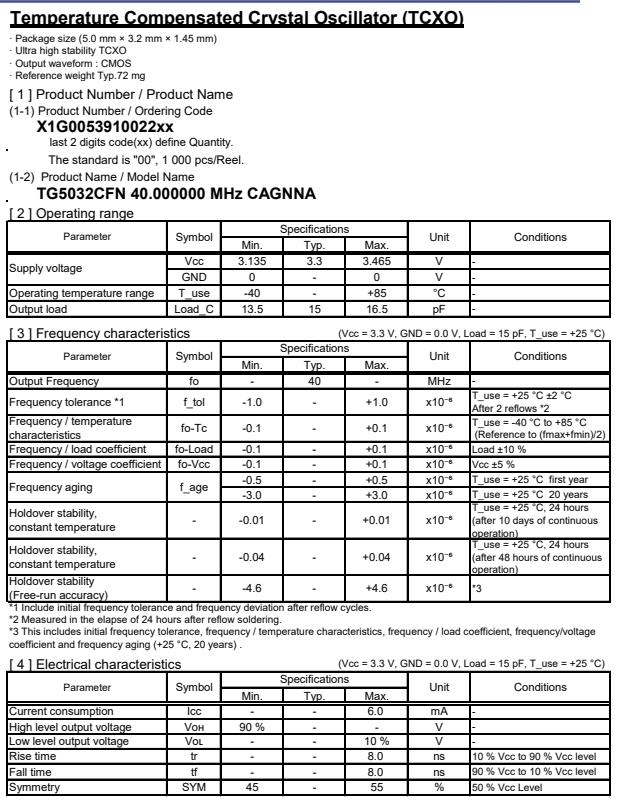 | X1G005391003100 | TG5032CFN | 40.000000 MHz | 5.00 x 3.20 x 1.45 mm | CMOS | 3.135 to 3.465 V | +/-1.0 ppm | -40 to +85 °C |