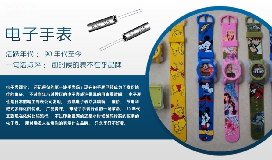 還記得小時候帶的電子手表嗎?電子表對我兒時的印象很深,記得讀小學三年級的時候班里有個同學他媽媽給他買了一塊電子表,很漂亮,因為是小孩子嗎?總喜歡拿著別人沒有的東西在別人面炫耀,隨著時間的過去班里有越來越多的同學都賣了電子表,后來有一天放學回到家里我就和我媽媽說我要買電子表,班里很多人都買了,可是媽媽沒有答應,那時候的電子表很便宜幾塊錢就能買到,可媽媽一直沒有跟我買,直到我讀四年級了那天我過生日,媽媽送給我一塊電子表當生禮物,當時特別高興,那是我擁有的第一塊電子手表。可是沒有帶多久有一次和同學玩耍時不小心把表給弄壞了,不動了,拿回家爸爸把表拆開來看能不能修好,當時我看到里面有很多奇奇怪怪的東西,也不知道是什么,可有一顆小東西到今天我接觸了這個行業(yè)才知道,原來它叫做晶振元件,是給電子表提供時間顯示的一顆電子元件。電子表最早由日本精工制表公司發(fā)明,而精工早期是做手表的,慢慢得也開始生產(chǎn)晶振,才會有今天的精工晶振品牌。