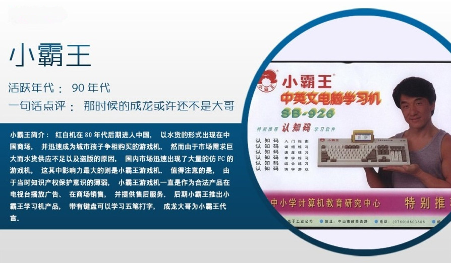 小霸王游戲機一聽就很熟悉吧,在那個年特別火,而且是于成龍代言的,那時候的成龍或許還不是大哥,小霸王游戲機一直是作為合法產(chǎn)品在電視臺播放廣告、在商場銷售,并提供售后服務。后期小霸王推出小霸王學習機產(chǎn)品,帶有鍵盤可以學習五筆打字,成龍大哥為小霸王代言。