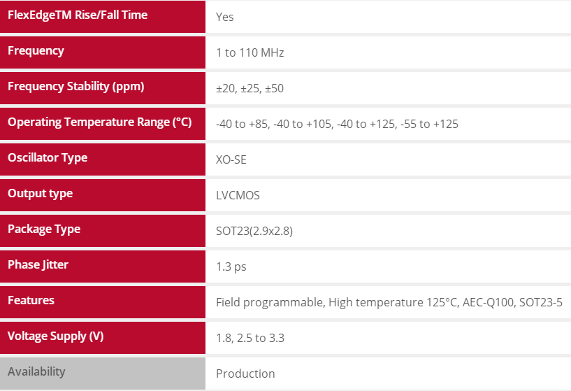 SiTime車用振蕩器相比石英振蕩器可靠性提高30倍,具有以下的特性與優(yōu)勢: - 滿足AEC-Q100標(biāo)準(zhǔn)一級(jí)(-40°C至+125°C)、二級(jí)(-40°C至+105°C)與寬泛的溫度要求(-55°C至+125°C)
