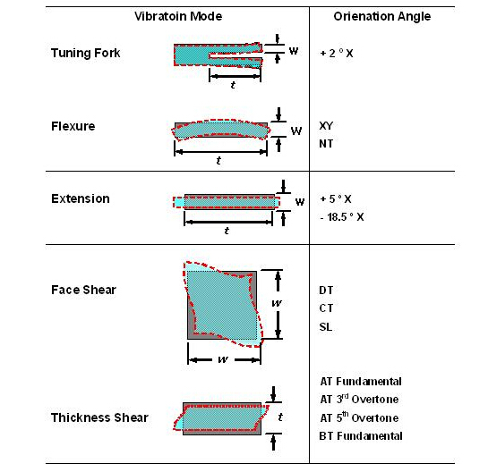 "CM200C32768HZFT" 經由不同的石英切割角度及不同電極型狀的電場效應, 石英芯片展現了各種不同的振動模態. 以經常產生的振動模態可以概分為擾曲模態(flexure mode), 伸縮模態(extension mode), 面剪切模態(face shear mode) 和 厚度剪切模態(thickness shear mode). 這幾種振動模態以簡單的方法在表一中可以看到. 在實際狀況中, 石英芯片并不是一定祇有單一種振動模態, 而可能有多種模態同時存在在一個石英芯片的振蕩中, 經由適當的設計, 可以壓制其它不希望產生的振動模態(unwanted mode), 來達到主要振動模態的最佳化.