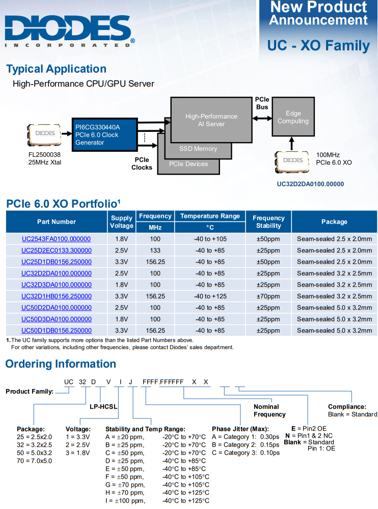 DIODES公司UC型號(hào)石英晶體振蕩器的超低抖動(dòng)使其成為網(wǎng)絡(luò)和計(jì)算應(yīng)用中PCIe 6.0時(shí)鐘的理想選擇。PCIe 6.0標(biāo)準(zhǔn)100MHz頻率,可選25~161MHz頻率范圍,靈活的頻率選擇支持各種系統(tǒng)設(shè)計(jì)要求,低15mA電流,支持1.8V, 2.5V, 3.3V供電電壓,標(biāo)準(zhǔn)HCSL器件的一半供電電流,超低<100fsRMS的抖動(dòng),片上終端無(wú)需外接電阻,節(jié)省電路板空間,降低成本。 特征,超低相位抖動(dòng),最大有效值0.1ps。(12kHz至20MHz),溫度范圍擴(kuò)展至125℃,完全無(wú)鉛和完全符合RoHS標(biāo)準(zhǔn),無(wú)鹵素和銻。“綠色”產(chǎn)品,在單獨(dú)的數(shù)據(jù)表(UCQ系列)下提供符合汽車標(biāo)準(zhǔn)的部件。應(yīng)用程序,網(wǎng)絡(luò)系統(tǒng),光學(xué)模塊,服務(wù)器和存儲(chǔ)系統(tǒng),專業(yè)視頻設(shè)備,測(cè)試與測(cè)量,F(xiàn)PGA/ASIC時(shí)鐘生成,112 g系列應(yīng)用程序。