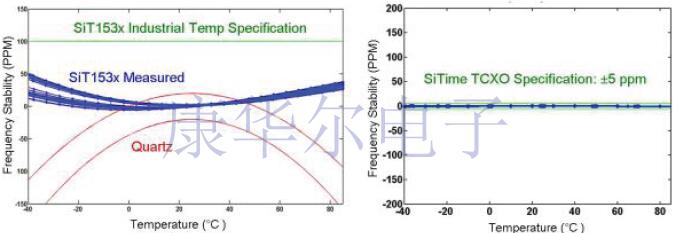 圖4a顯示了基于SiT1532MEMS的32.768kHz振蕩器的頻率穩(wěn)定性與溫度特性曲線.工業(yè)虛線(<100PPMp-p)的SiT1532規(guī)格限制以藍(lán)色虛線表示.紅色曲線顯示了使用基于石英的XTAL音叉類型的32.768kHz振蕩器的典型規(guī)格極限.圖4b顯示了基于SiT1552MEMS的TCXO(溫度補(bǔ)償振蕩器)的頻率穩(wěn)定性,該器件已在多個(gè)頻率點(diǎn)上進(jìn)行了出廠校準(zhǔn)(微調(diào)),以確保在整個(gè)溫度范圍內(nèi)具有極高的穩(wěn)定性.